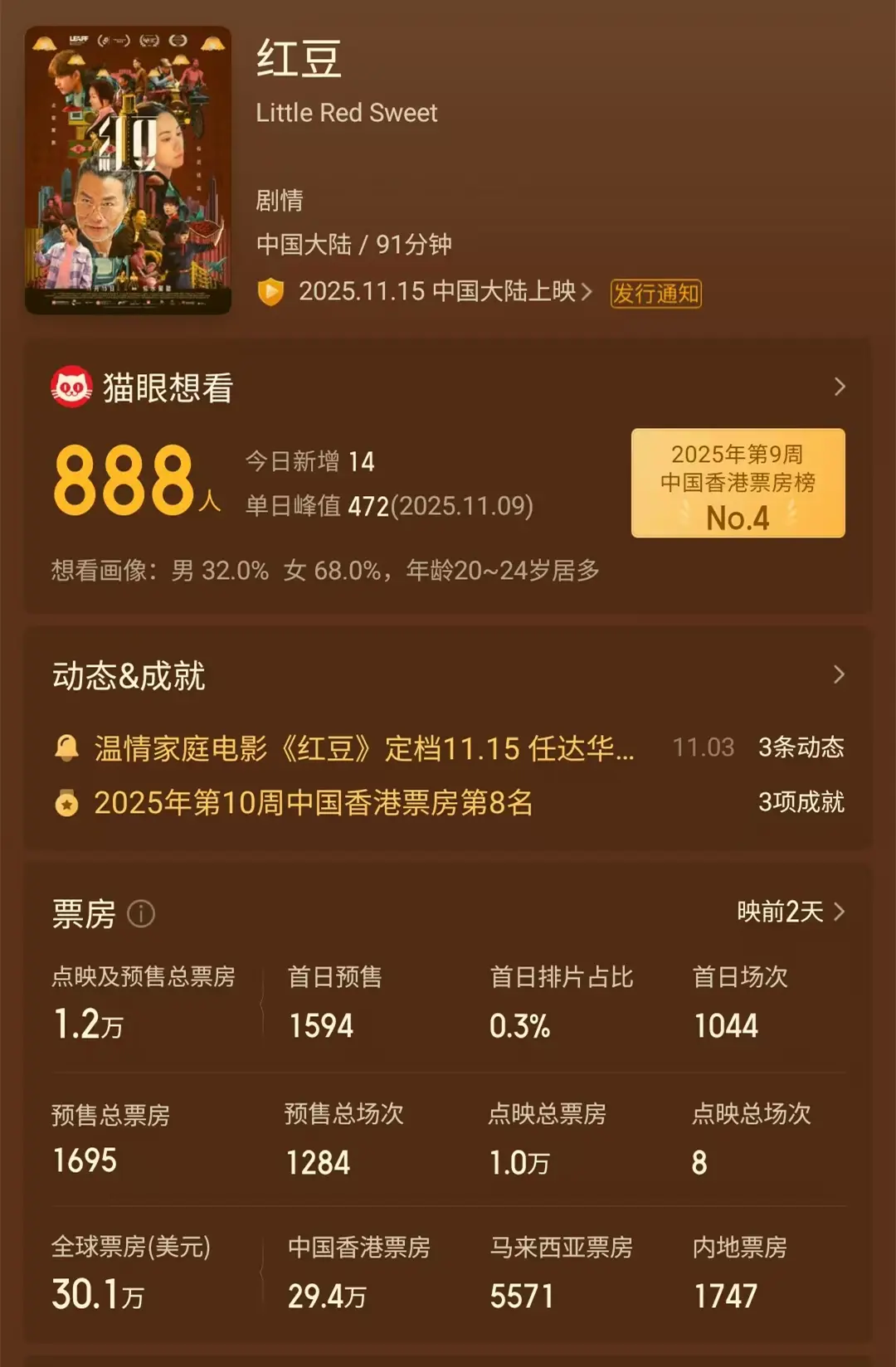 11月13日,离院线电影《红豆》11月15日的正式上映,只有一步之遥。然而国华通配资,这部由任达华、邓丽欣主演,并且入围了澳门电影节最佳男女主角的港片,截至目前的票房预售只有1695元。可能您会说,是不是这部《红豆》的排片场次太少,造成的呢?并非如此,该片预售场次是1284场。这意味着,这部电影每一场都无法产生两元票房。